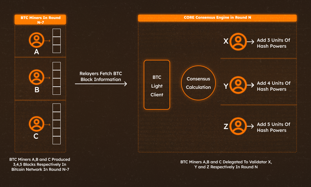 Relayers are responsible for monitoring the Bitcoin network and transmitting blocks and transaction data to the Core network. Within the Core network, an on-chain embedded BTC light client processes the incoming data from relayers and forwards the delegation information (including hash power and Non custodial staking) to the "Delegation Hub." The Delegation Hub serves as the central component responsible for managing and overseeing delegations within the Core network. During a 1-day round, the Core network calculates the DPoW for each validator by counting the number of blocks the miners delegated to a validator one week prior. For instance, if the round occurs on a Thursday, Core will tabulate the DPoW for each validator by counting blocks from last Thursday.&#x20;